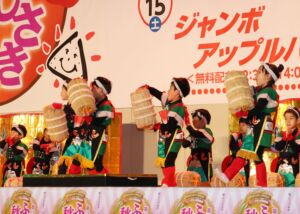 豊作にぴったりの「南部俵積み唄」にのせておゆうぎを披露し、見事に米俵を積み上げました。「めでたいな~、めでたいな~ 」