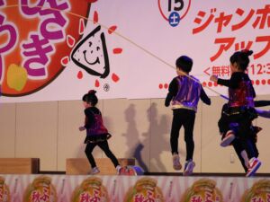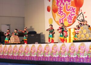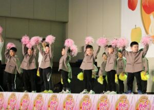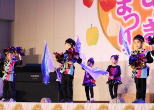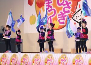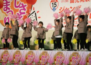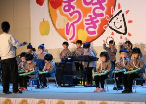 町を挙げての収穫祭「ふじさき秋まつり」にみずきこども園の年長組・年中組の子ども達が参加して、元気にゆうぎや縄跳び、器楽合奏を発表しました。