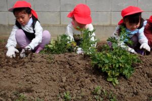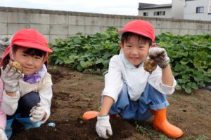 8月12日 ときわこども園の年長組さんは、ワゴン車に乗って近くにある系列園のみずきこども園へ出かけました。なぜって、それは春に植えてもらったジャガイモをみんなで掘り掘りするためです。先週の雨で予定が伸び伸びになっていましたが、いよいよこの日、みずきこども園の年長組さんと一緒に収穫です。