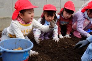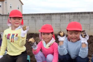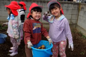 「あっ あった」「あった」「3つもあった」「土 かた~い」「バケツください」「せんせい、これ食べらる?」「もうないよ 前にすすんでいい」