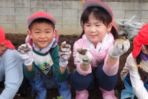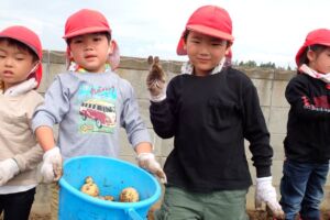 「あっ あった」「あった」「3つもあった」「土 かた~い」「バケツください」「せんせい、これ食べらる?」「もうないよ 前にすすんでいい」