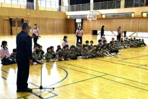 ここで校長先生のお話です。しっかり聞いて「はい」とお返事ができました。