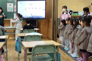この事業は、就学前の年長児が小学校生活を楽しくスタートすることができるように、学校探検や授業見学、一年生との交流活動など、毎年行われているものです。