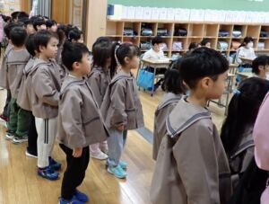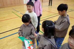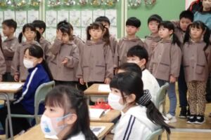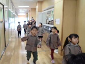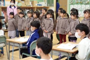12月9日㈫ 年長児もも組さんが、小学校体験にみずきこども園のもも組さんと一緒に参加するため、常盤小学校を訪問しました。
