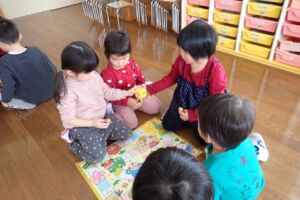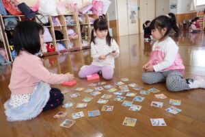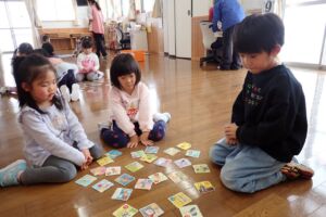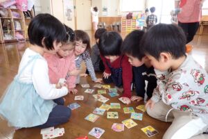 札を読む役と取る役にわかれ、大きいお友だちが読み手になり、どこにあるのか一緒に探しています。
