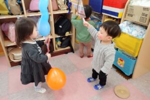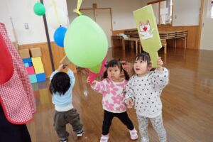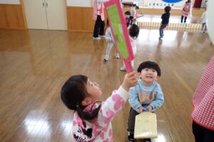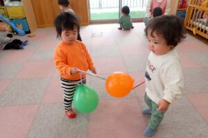 手づくりの羽子板を持って風船をつきました。ひとりであそぶ(つき羽根)、ふたりであそぶ(追い羽根)という二つのあそび方を楽しみました。