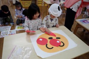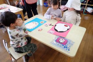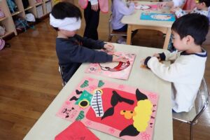目隠ししての福笑い、うまくパーツを並べることができるかな。一生懸命がんばったのに「あれ?」変な顔に・・・大盛り上がりでした。