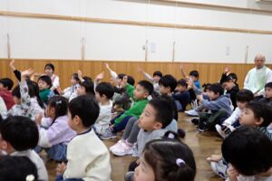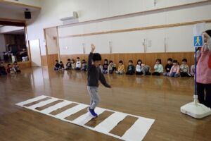 はじめに、雪道の危険性についてDVDを観たり、警察の方からはパネルを使ったクイズをしながら交通ルールを教えてもらいました。子どもたちは真剣に耳を傾けています。