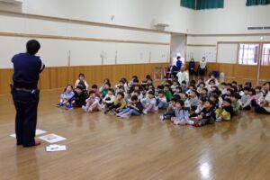 1月14日(水)藤崎町交通安全母の会によります交通安全指導が行われました。こちらの団体は、藤崎町内のこども園・保育園などを訪ね、園児を対象に交通安全や防犯に関する教育を行うものです。毎年この時期に行われ、交通事故防止を呼びかけています。