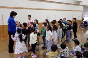 4月から1年生になるもも組さんに反射材キーホルダーがプレゼントされました。「ランドセルにつけようね」と子どもたちは大喜び!!みんなで交通ルールを守り小学校に通うことを約束しました。