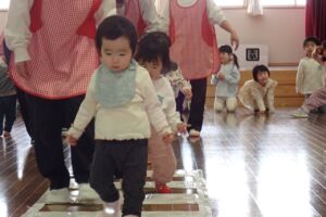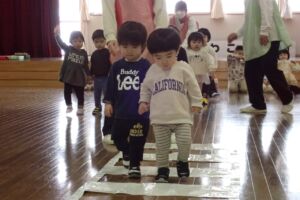 警察の方から教えてもらった横断歩道の渡り方を再確認して、3歳未満児クラスのお友だちも挑戦しました。