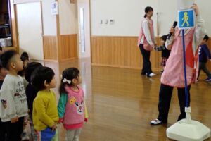 1月14日(水)藤崎町交通安全母の会によります交通安全指導が行われました。こちらの団体は、藤崎町内のこども園・保育園などを訪ね、園児を対象に交通安全や防犯に関する教育を行うものです。毎年この時期に行われ、交通事故防止を呼びかけています。