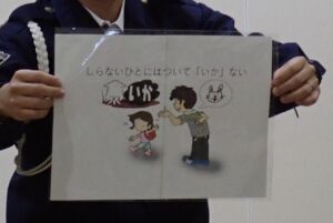 防犯のための5つの行動の頭文字をとった標語です。「ついて〝いか〟ない」「〝の〟らない」「〝お〟おきな声で叫ぶ」「〝す〟ぐ逃げる」「〝し〟らせる」の子ども向けの合言葉です。