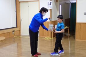 4月から1年生になるもも組さんに反射材キーホルダーがプレゼントされました。「ランドセルにつけようね」と子どもたちは大喜び!!みんなで交通ルールを守り小学校に通うことを約束しました。