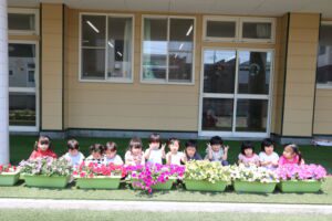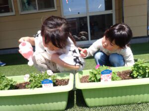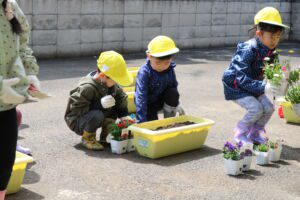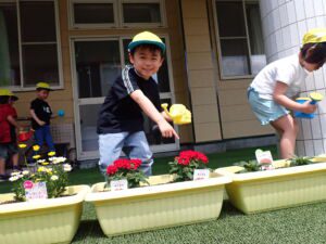 5月上旬に年長組さん年中組さんがプランターに花の苗を植えました