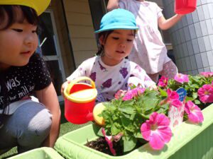 自分たちで植えたお花が大きくなっていく様子を毎日楽しみにしながら、水やりをします。お迎えの際には、お母さんと一緒にお花を見に行きます。