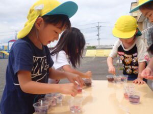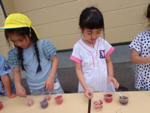 年長組さんは、たくさん咲いた花びらや咲き終わった花の芯など使って色を抽出することに熱心に取り組んでいました。サフィニアの花びらが色が出やすいという研究成果がでておりました。
