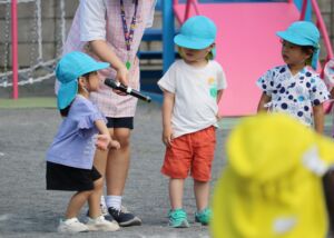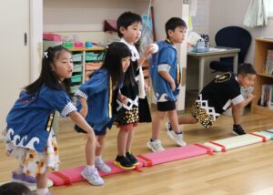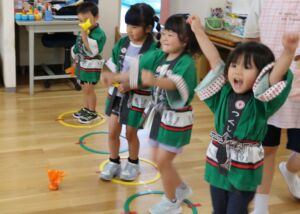 当日は園庭でポケモン音頭を踊ったり、キャンプファイヤーごっこをして楽しみました。そのあと室内へ移動して保育教諭によるダンスパフォーマンスやゲームコーナーでおまつりの雰囲気を味わいました。