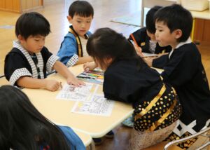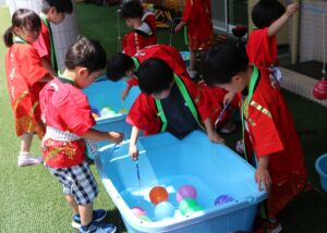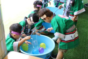 的当てゲーム、ヨーヨー釣りなどのゲームコーナーを異年齢で構成した3つのグループで交代で楽しんでいきます。