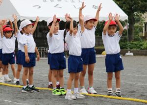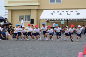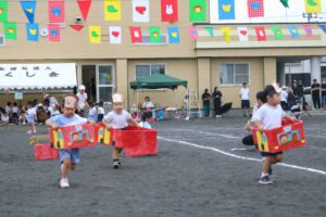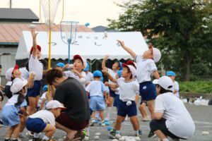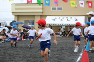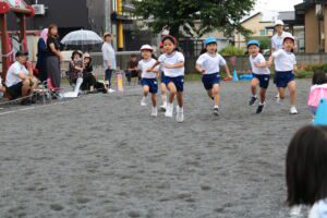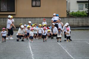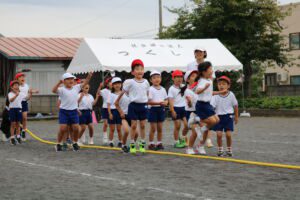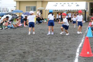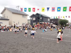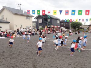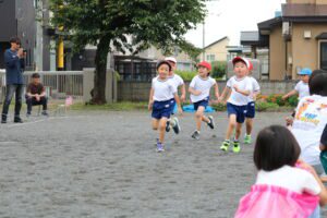 普段のあそびの中で思い切り体を動かすことを楽しんでいる子ども達は、身体感覚が育ち、体幹や運動機能も少しずつ発達してきています。また、競技の中でみんなで協力したり、負けまいと全力を出そうとする姿、転んでもあきらめずに立ち上がる姿やそれを一生懸命に応援する姿も見られ、精神的にも成長が感じられます。