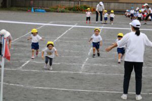 年少のみかん組さんはコースを2周。だんだんと競争心も芽生えてきています。卒園児のおにいさん・おねえさんがお手伝いで、たくさんコース内にしゃがんでくれたので、コースをショートカットする子はいませんでした。