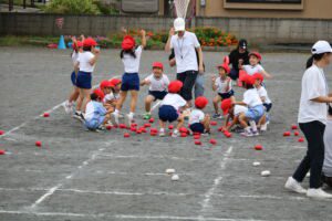 3歳児・4歳児・5歳児が混合になり、3チームに分かれて行った玉入れ!!