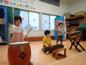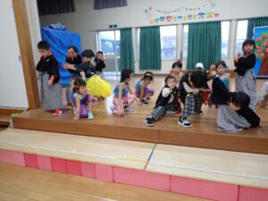 今週は「おゆうぎ会ごっこ」で好きな衣装を身に着けたり、思い思いに他のクラスのダンスをしたり、太鼓をたたいてみたりして余韻を楽しみました。