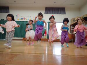 今週は「おゆうぎ会ごっこ」で好きな衣装を身に着けたり、思い思いに他のクラスのダンスをしたり、太鼓をたたいてみたりして余韻を楽しみました。
